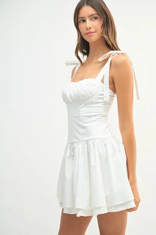 A shoulder tie corset panel mini dress is a flirty and stylish dress featuring shoulder ties and corset panel detailing. This mini dress is designed to accentuate the waist and create a flattering silhouette. The shoulder ties add a feminine touch and can be adjusted for a custom fit. The corset panel adds structure and a touch of glamour to the dress, making it a trendy choice for parties or special occasions. Pair this dress with heels and simple accessories for a chic and fashionable ensemble.