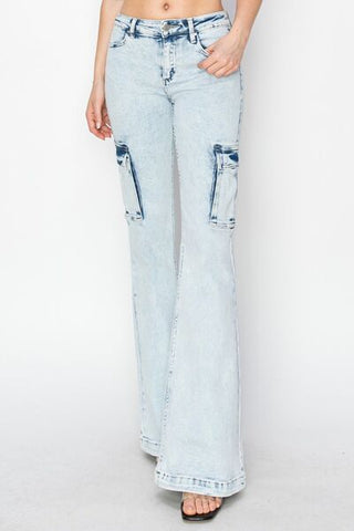 The high rise cargo flare jeans combine utility and style for a contemporary look! Featuring a flattering high-waisted design, these jeans enhance your silhouette while providing comfort. The cargo pockets add a functional element, making them perfect for storing essentials. With a flared leg, they create a trendy retro vibe that pairs well with both casual and dressy tops. Crafted from soft, durable fabric, they ensure all-day wearability. Embrace a bold fashion statement with these versatile cargo flare jeans!