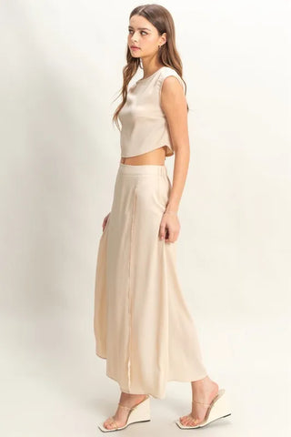 The Sleeveless Top and Maxi Skirt Set is a versatile and stylish ensemble that offers effortless coordination. The sleeveless top provides a sleek and elegant silhouette, while the maxi skirt lends a flowy and flattering look. This set is perfect for creating a coordinated outfit with minimal effort. Wear it together for a chic and put-together look, or mix and match the pieces with other items in your wardrobe for added versatility. Whether for a special occasion or a casual outing, this set is a practical and fashion-forward choice.