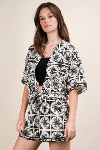 A tropical printed shirt top and shorts set is a stylish and coordinated outfit choice for warm weather. The vibrant print evokes a vacation-ready vibe, while the matching top and shorts create a cohesive and put-together look. This set is perfect for beach days, summer outings, or tropical getaways. Pair it with sandals and sunglasses for a trendy and effortless ensemble.