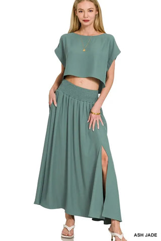 This heavy woven span crop tee and skirt set is a trendy and chic ensemble for your wardrobe. The crop tee offers a modern twist to the classic tee design, while the matching skirt completes the coordinated look. The heavy woven span fabric adds structure and sophistication to the set, making it a stylish choice for both casual and dressed-up occasions.