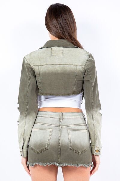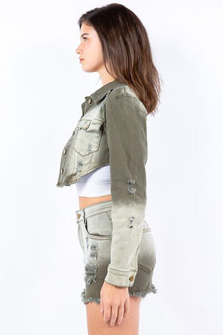 A distressed ombre washed cropped denim jacket is a trendy and edgy piece of clothing. The distressed detailing gives it a worn-in look, and the ombre wash adds a gradient effect to the color. The cropped length adds a modern twist to the classic denim jacket style. This jacket can be styled in many different ways, whether you're going for a casual, grunge-inspired look or dressing it up with a feminine twist. It's a versatile and fashion-forward piece that can add an interesting element to your outfit.
