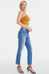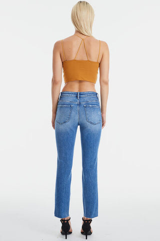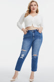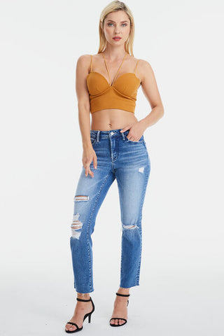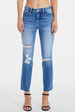 These high-waisted cropped straight-leg trousers are the epitome of modern chic. They feature unique whiskering and fading details, giving them a distinct and edgy look. The frayed hem adds a touch of casual cool, perfectly balancing sophistication with a hint of undone style. These trousers are versatile and can be paired with a crisp white blouse and heels for a polished office look, or dressed down with a graphic tee and sneakers for a more casual vibe. Effortlessly stylish, these trousers are a must-have for any fashion-forward wardrobe.