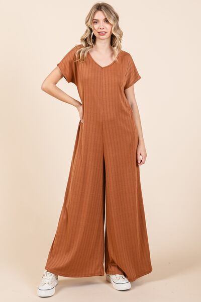 BOMBOM Ribbed Short Sleeve Wide Leg Jumpsuit