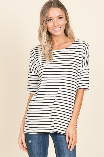 The Striped Round Neck T-Shirt is a timeless and versatile piece that offers a classic and casual look. Featuring a stylish striped pattern, this t-shirt adds a touch of nautical charm to your outfit. The round neckline provides a flattering and easy-to-wear silhouette that is perfect for everyday styling. Pair it with jeans for a laid-back vibe or dress it up with a skirt for a more polished ensemble. Elevate your wardrobe with the Striped Round Neck T-Shirt, a wardrobe essential that seamlessly blends comfort and style. Embrace the classic appeal of stripes and enjoy the versatility of this t-shirt that can be worn for various occasions and layered with different pieces.