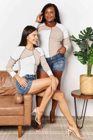 Show off your style with this color block top. This top is crafted from a soft, comfortable material and features exposed seams and a ribbed design to show off your curves.