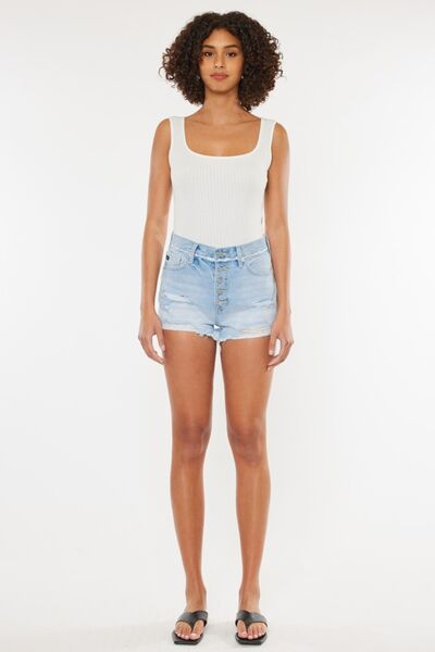Distressed Button Fly Denim Shorts are a trendy and versatile addition to your summer wardrobe. The distressed detailing adds a touch of edgy appeal to the shorts, giving them a cool and casual vibe. The button fly closure offers a stylish and unique detail that sets these shorts apart. These shorts can be easily dressed up with a blouse and sandals or dressed down with a graphic tee and sneakers. Perfect for a day out with friends or a casual weekend getaway. Overall, Distressed Button Fly Denim Shorts are a must-have piece for those who love to add a touch of trendiness to their summer outfits.