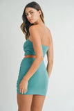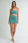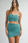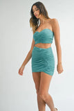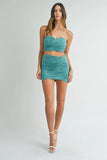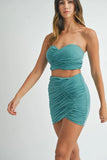 The Ruched Tube Crop Top and Skirt Set is a fashionable ensemble that features a ruched design for added texture and style. This set includes a cropped tube top and a coordinating skirt, creating a cohesive and trendy look. Perfect for various occasions, this outfit can be paired with heels or sandals for a complete and chic outfit.