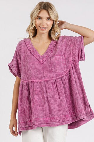 This oversized top features a mineral wash gauze fabric with a babydoll design and V-neckline for a stylish and relaxed look. The mineral wash gives the fabric a unique and vintage appearance, adding character to the top. The babydoll silhouette offers a flattering and comfortable fit, perfect for a casual and chic outfit. The V-neckline adds a touch of femininity and versatility to the design. Pair this top with your favorite bottoms for a laid-back and trendy ensemble. Embrace effortless style with this mineral wash gauze babydoll V-neck oversized top!