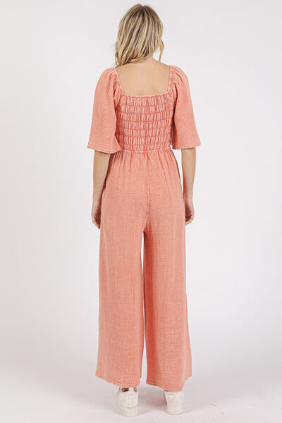 A mineral wash gauze ruched wide leg jumpsuit typically features a relaxed fit, wide legs, and ruched details that add a touch of texture and visual interest. The mineral wash adds a vintage, worn-in look to the fabric. This type of jumpsuit is perfect for a casual yet stylish outfit, and can be dressed up or down depending on the occasion.