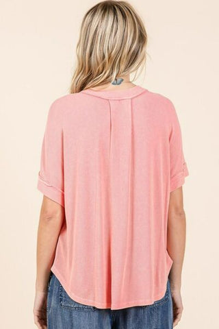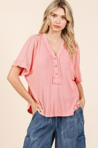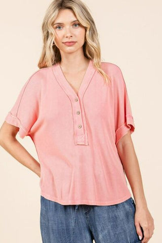 The Mineral Wash Henley Short Sleeve Waffle Knit Top is a versatile and stylish piece that combines comfort with a touch of edgy flair. With its mineral wash finish, this top has a trendy and unique look that sets it apart from basic Henley tops. The waffle knit texture adds a cozy and tactile element to the design, perfect for adding depth and interest to your outfit. The short sleeves provide a breathable and casual feel, making it ideal for layering or wearing on its own. Pair this Henley top with jeans or shorts for a relaxed and effortlessly cool look that's easy to style. Elevate your everyday wardrobe with the Mineral Wash Henley Short Sleeve Waffle Knit Top as a contemporary and on-trend essential.