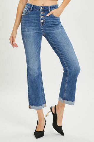The Button-Fly Cropped Bootcut Jeans are a stylish and modern twist on a classic denim silhouette. The button fly closure adds a retro and chic touch to the cropped bootcut style. Made from high-quality denim fabric, these jeans are durable and comfortable for all-day wear. The cropped length is perfect for showing off your favorite footwear. Pair them with a tucked-in blouse or a cropped top for a trendy and flattering look. Whether you're dressing them up for a night out or keeping them casual for a day of shopping, these jeans are a versatile and fashion-forward choice for any occasion.