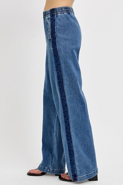 Elastic Waist Wide Leg Jeans are stylish and comfortable bottoms that offer the convenience of an elastic waistband for a flexible and adjustable fit. The wide-leg design provides a trendy and relaxed silhouette, perfect for a casual yet fashionable look. These jeans are versatile and can be dressed up or down depending on the occasion. The elastic waist ensures all-day comfort while maintaining a flattering shape. Pair them with a tucked-in blouse or a fitted top for a chic and effortless outfit.
