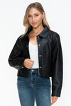 A snap-down long sleeve PU leather jacket is a fashionable and versatile piece made from faux leather material. This jacket typically features a snap-button closure on the front, long sleeves, and a crop length. It is a trendy and edgy option that can add a stylish touch to a variety of outfits.